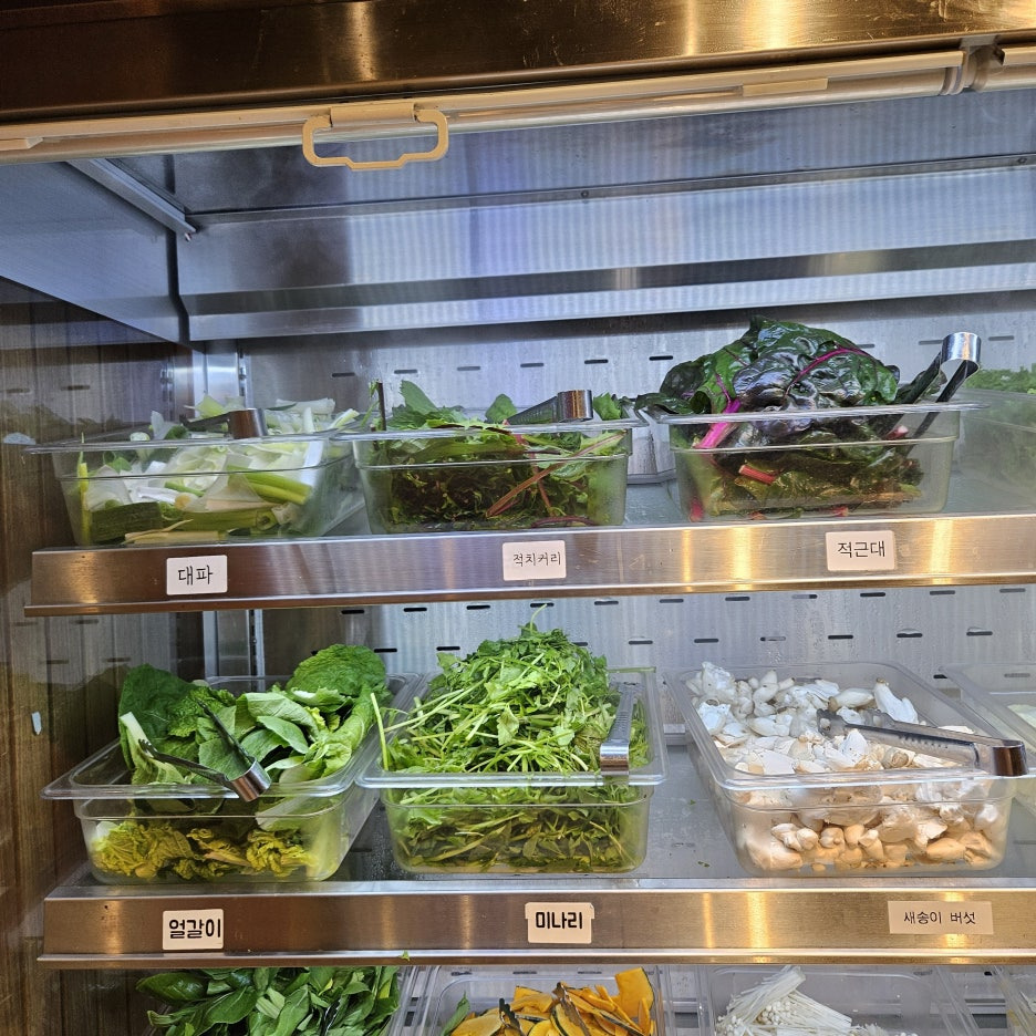 샤브샤브 야채로는 대파, 적치커리, 적근대, 얼갈이, 미나리, 새송이버섯, 청경채, 단호박, 팽이버섯, 땡초, 숙주, 치커리, 취나물, 배추가 있구요.