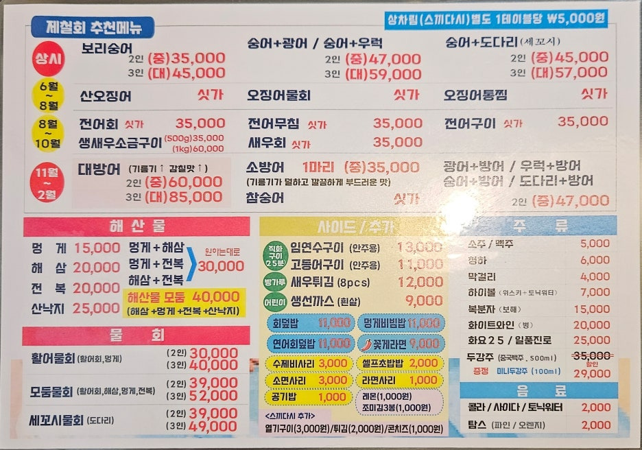 실제 메뉴판에 있는 메뉴외에 수족관에 따로 붙어있는 메뉴가 꽤 많았어요.