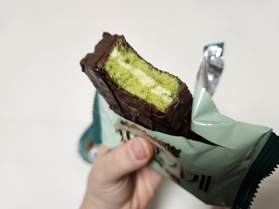 연두색 시트사이에 크림이 있고, 겉은 초콜릿으로 코팅이 되어있어요.