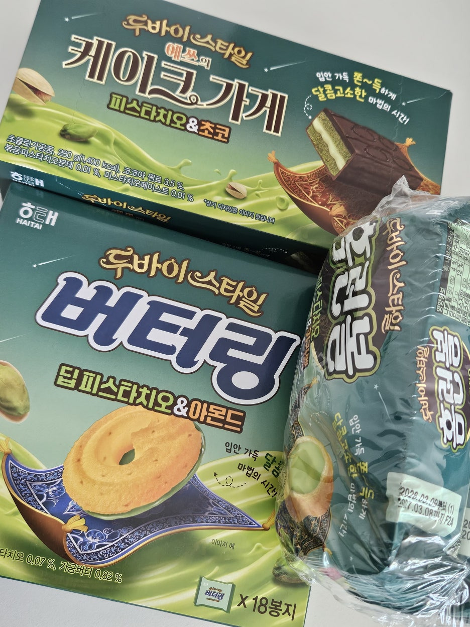 두쫀쿠를 겨냥한 해태의 두바이스타일 시리즈!! <버터링>, <예쓰의 케이크가게>, <홈런볼> 입니다.