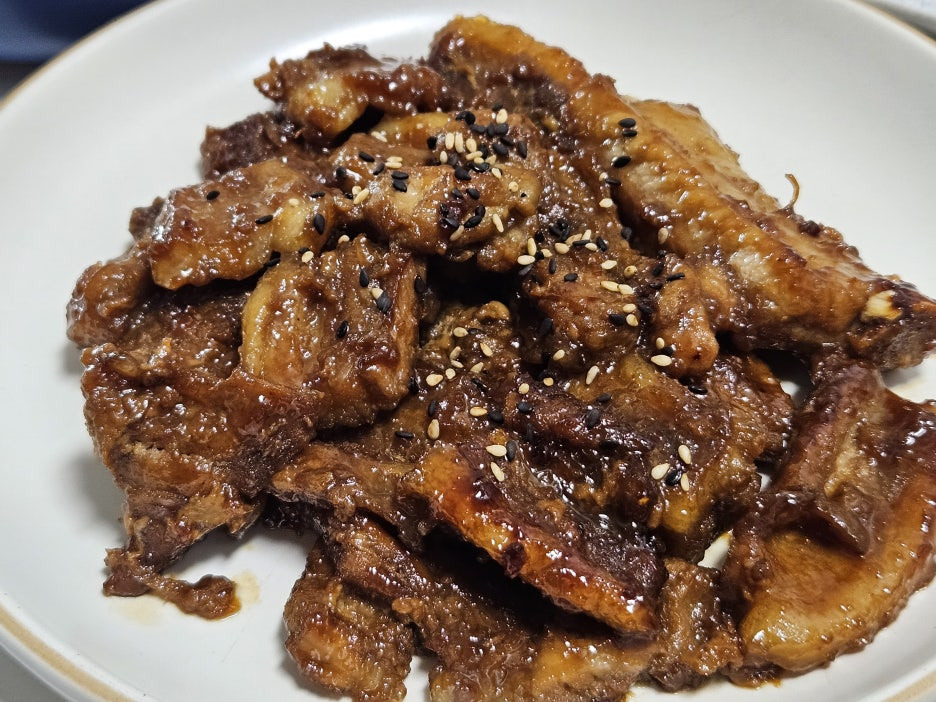 위 사진은 고기만 얹어서 굽는 중이고, 이후 익을때쯤에는 남아있는 양념을 부어 쫄였답니다😆