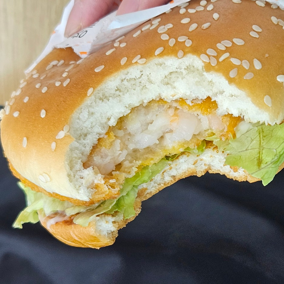 버거빵은 다른 프랜차이즈들과 비슷하고 속 패티는 잘게 다져진 새우살과 함께 크게 설어져있는 조각으로 식감이 조금 있는 편이에요.